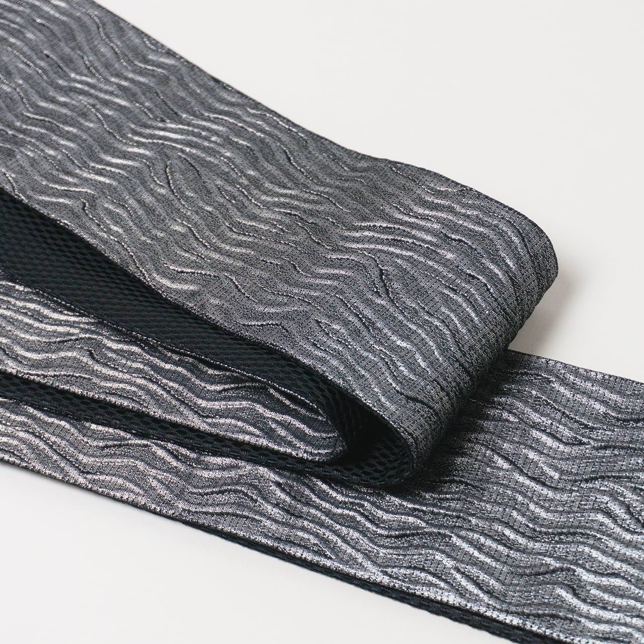 表面は鈍い光沢のあるシルバー、裏面はバーズアイ生地のブラックを使っています。