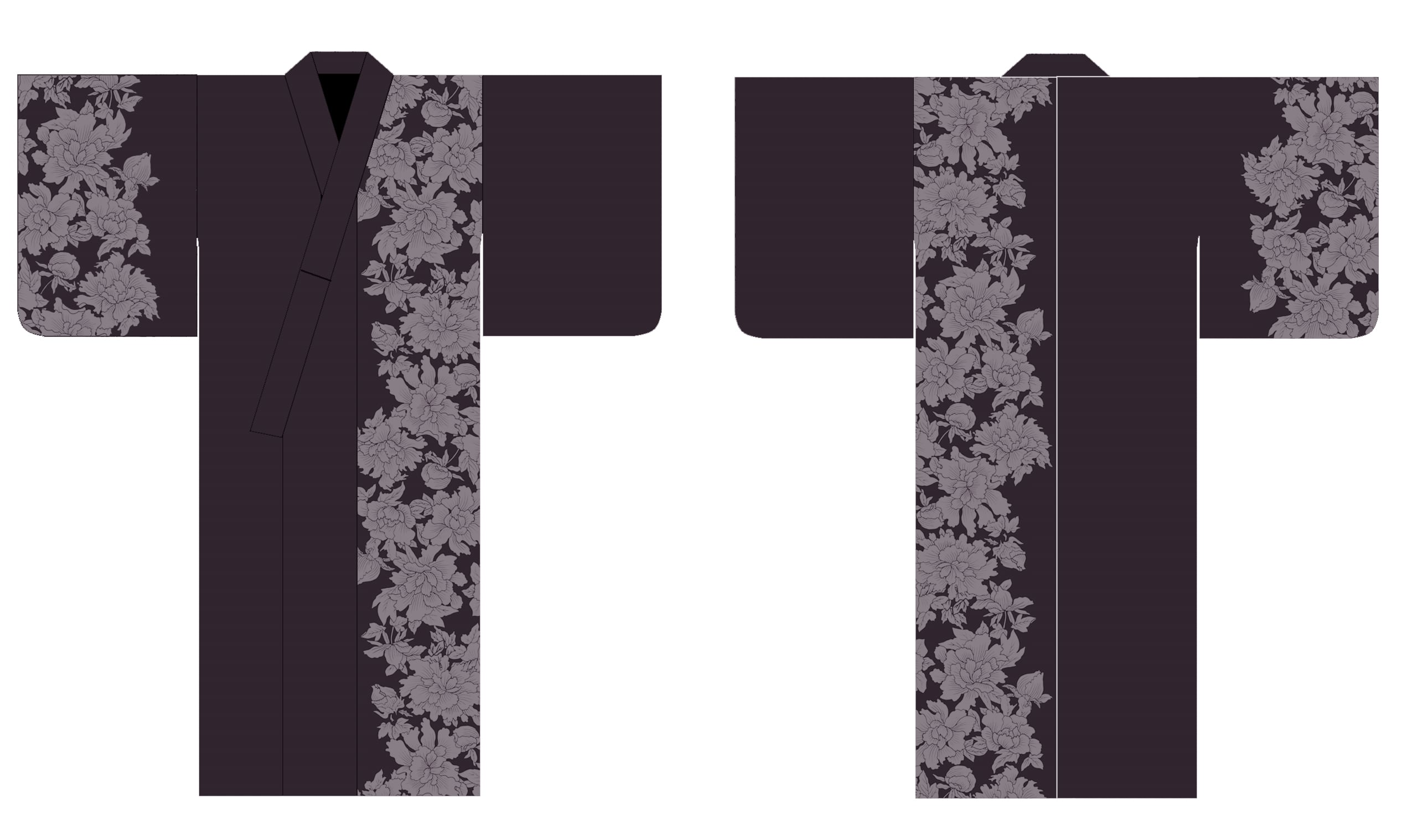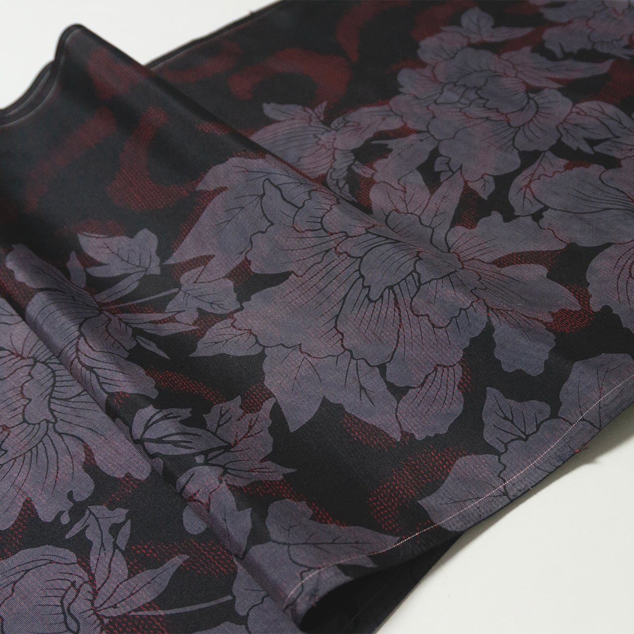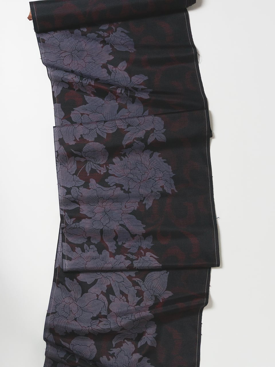 淡く抜染(ばっせん)した牡丹の柄が、「身ごろ片方だけ」+「袖片方だけ」に入ります。