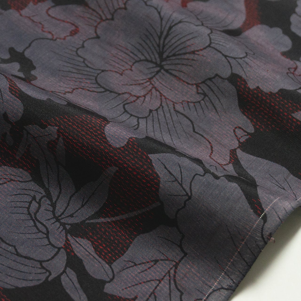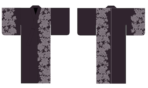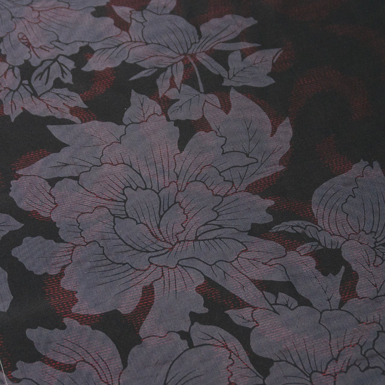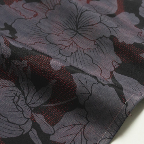 淡く抜染(ばっせん)した牡丹の柄が、「身ごろ片方だけ」+「袖片方だけ」に入ります。