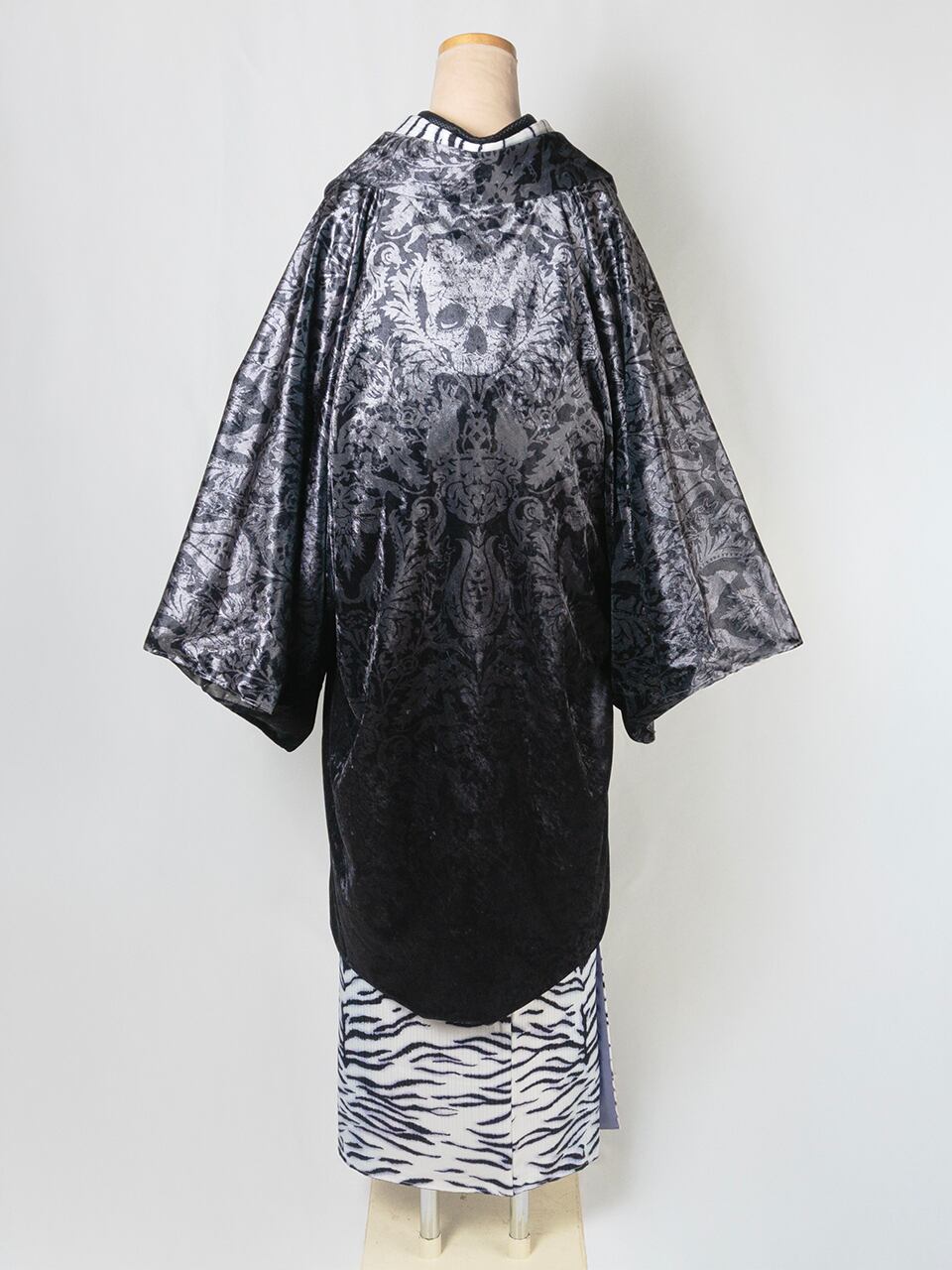 羽織の裾から背中に向かってグラデーションで描かれたドクロ更紗。